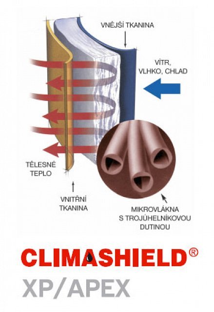 Izolace Climashield APEX je nejefektivnější tepelně-izolační materiál na současném světovém globálním trhu. Je to přímý nástupce legendárních izolací Climashield XP, Polarguard Delta a Polarguard 3D. Je to absolutní světová špička v izolaci. Je nejpevnější, nejodolnější, nejlehčí, vysoce trvanlivý, pružný, rychleschnoucí. V porovnání s jakýmkoli konkurentem zachovává nejdéle "loft" a to i po opakovaném používání, praní a sušení. Jeho extrémně robustní trojrozměrná 3D struktura - stejná jako u peří - je tvořena tepelně pojenými překříženými vlákny s dutinou trojúhelníkového průřezu. Průměr vláken je právě uprostřed mezi klasickými dutými vlákny a mikrovlákny a chytře tak využívá předností obou technologií. Izolačními vlastnostmi se nejvíce ze všech syntetických izolací přibližuje peří, se kterým je výkonem srovnatelný, ale navíc slučuje všechny výhody dosud vyvinutých vláken, dutých vláken a mikrovláken. Jeho životnost, nízká hmotnost a tepelná izolace jsou nedostižné a dokonce ještě vyšší než u legendárních předchůdců. Nekonečné vlákno je obzvláště stabilní a používáním prakticky neroztrhnutelné. Na rozdíl od konkurenčních izolací se nesetřepává, vlákna se neoddělují, necuchají a netvoří chomáčky. Nevzniká ztenčení izolačního materiálu nebo místa bez výplně ani po létech používání. Používáme originální Climashield APEX vyrobený skutečně přímo v USA. Ne tedy jeho napodobeniny vyrobené v levných asijských zemích, jak je u většiny konkurence zvykem.